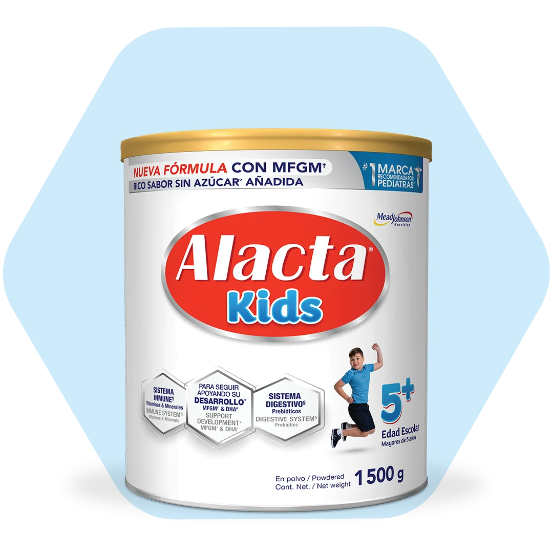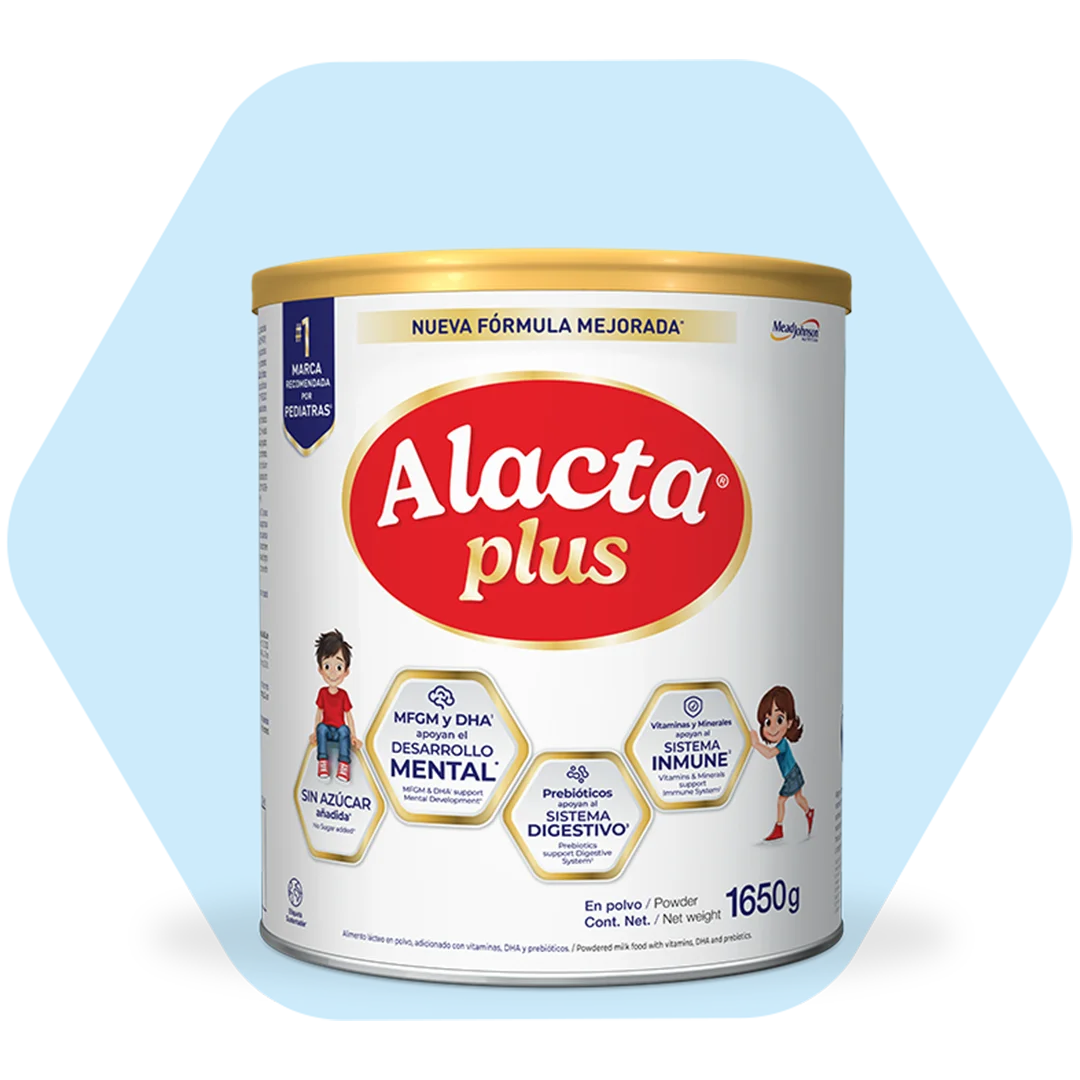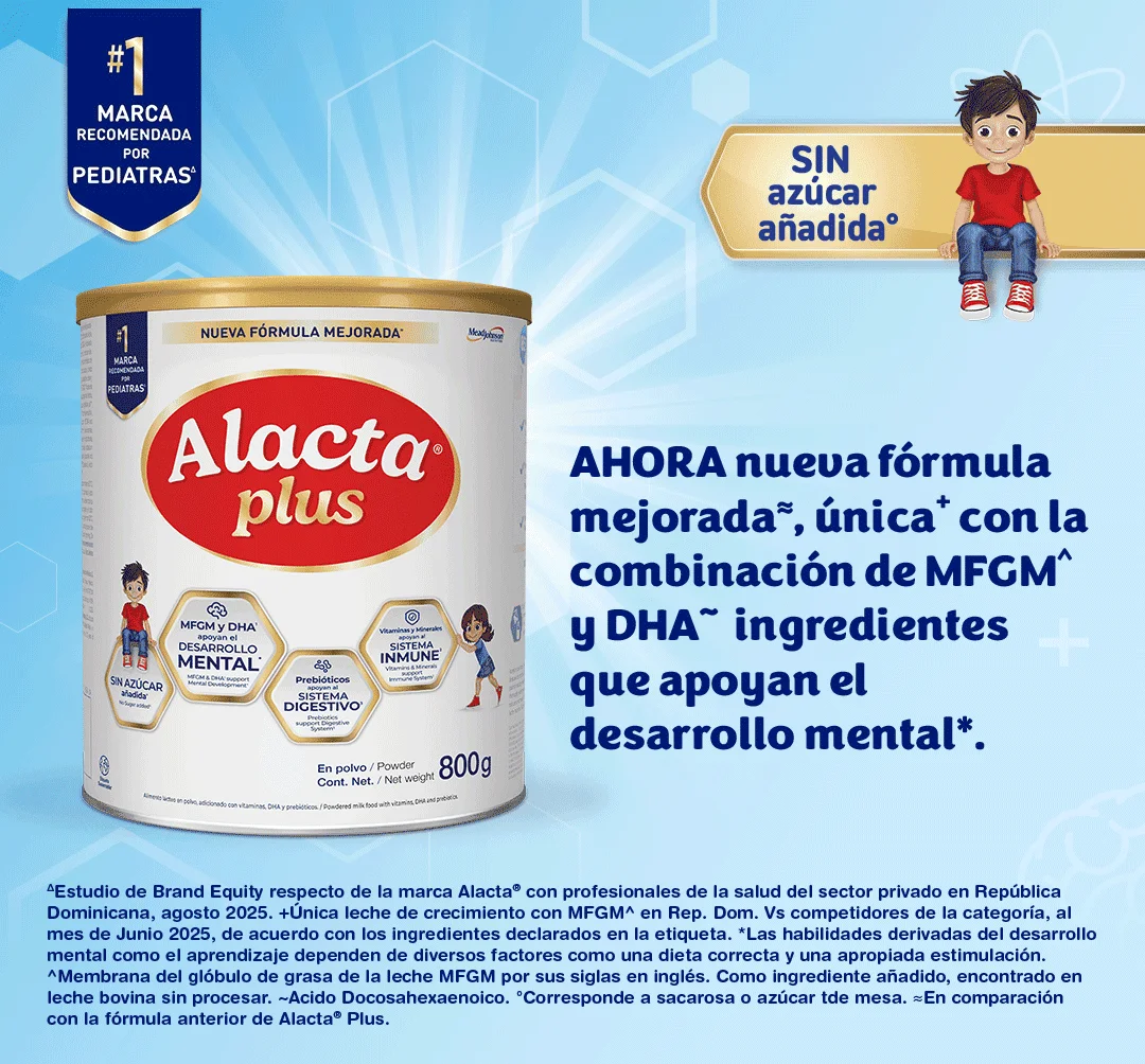 †Hasta un 85% del tamaño total que tendrá en la vida adulta. Scamman, RE. The measurements of the body in childhood. En: Harris JA, Jackson CM, Paterson DG, Scammon RE, editores. The measurement of man. Minneapolis, USA: University of Minnesota Press; 1930, pp 173-215 Curvas de Scammon. ∆ Estudio Brand Equity respecto de la marca ALACTA® con profesionales de la salud del sector privado en República Dominicana, agosto, 2025. ¬ Recomendado a partir de los 24 meses a discreción del pediatra. Este producto no es ni intenta ser, un sucedáneo o complemento de la leche materna. “Junto con una alimentación balanceada”. ^ Membrana del glóbulo de grasa de la leche MFGM por sus siglas en inglés. Como ingrediente añadido, encontrado en leche bovina sin procesar. ¬ Ácido Docosahexaenoico. *Las habilidades derivadas del desarrollo mental como el aprendizaje dependen de diversos factores como una dieta correcta y una apropiada estimulación. ≠ Vitaminas, minerales y una mezcla exclusiva de PDX/GOS, además de DHA – y MFGM^ componentes que cuentan con evidencia científica relacionada con el sistema inmune en los primeros años de vida.
